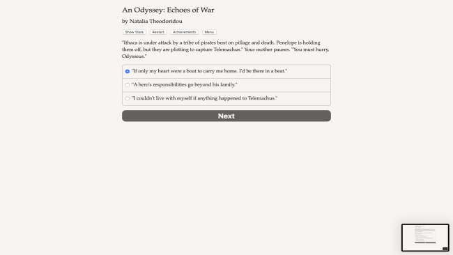 An Odyssey: Echoes of War is an interactive retelling of Homer’s The Odyssey by Natalia Theodoridou, where your choices control the story. It’s entirely text-based—250,000 words, without graphics or sound effects—and fueled by the vast, unstoppable power of your imagination.
