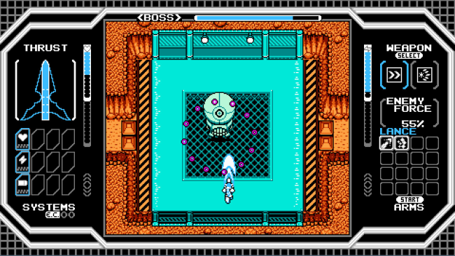 ASTROLANCER offers the player a free selection of secondary weapons, and potentially over a dozen special ARMS with which to destroy the enemy. Find hidden rooms and collect Energy Cells to obtain upgrades between stages and customize your abilities even further! Not everything can be acquired in one playthrough, keeping the game fresh when the player is ready to take on the next difficulty level.