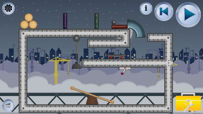 This is a “Rube Goldberg” style puzzle game inspired on the award winning “The incredible Machine”. Discover what it takes to be a scientist and build awesome contraptions with simulated real physics using trampolines, balls, explosives and much more. The world is quickly running out of power and people are starting to suffer the consequences of the energy crisis. Luckily there is one brilliant scientist who is one step ahead and has made plans to build a machine that can generate clean electricity for the whole world. But his invention, the Awesome Machine, is a puzzle that needs to be built. That’s where the fun begins! Your job will be to help the scientist do this. Things may seem easy at first, but you will have a lot of work before the Awesome Machine is ready! The scientist will take you to different places and through 50 awesome levels where you will use technology, trampolines and many other tools! Discover what it takes to be a scientist and build the Awesome Machine! FEATURES
