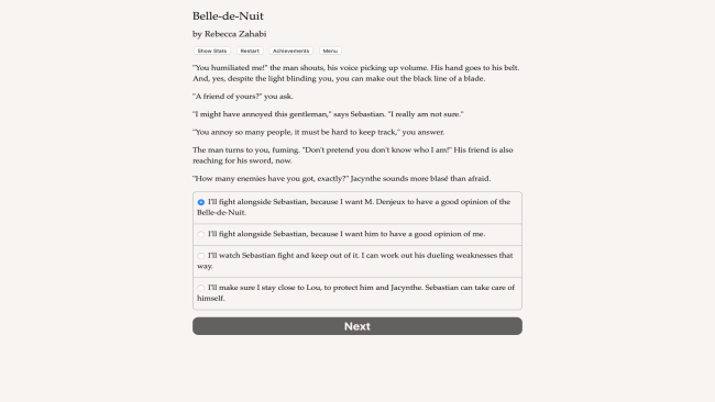 Win duels and hearts as a swordswoman at the Belle-de-Nuit, Paris’s finest luxury brothel! Fight for the honor of the ladies of the night in this game of swords and seductions. Belle-de-Nuit is a 115,000-word interactive romance novel by Rebecca Zahabi, author of Never Date Werewolves. It’s entirely text-based, without graphics or sound effects, and fueled by the vast, unstoppable power of your imagination. The Belle-de-Nuit is yours to protect, and yours to love. Some of the courtesans have been your best friends for years, and maybe you have a childhood sweetheart whom you’d like to steal from her customers… There is also the shy bartender, with a heavy secret and liquor-scented lips. They have arrived in Paris without telling anyone where they came from, why they travelled this far, or why they always seem so nostalgic. But Madame wants you to focus on securing the next big patron for the Belle-de-Nuit. Unfortunately, he has a duelist of his own, Sebastian–so frustratingly good at fencing, he threatens your reputation as the best duelist in Paris. You are burning to defeat him in a duel…but do you want to best him with the blade, or bed him? Madame’s house is filled with lovers. But which will be yours?