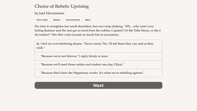 Lead the revolt against a bloodthirsty empire! You grew up under the iron fist of the Hegemony. Now is your chance to end their blood-fueled magic, as you forge a ragtag outlaw band into a rebel army. Choice of Rebels: Uprising is a 637,000 word interactive fantasy novel by Joel Havenstone, where your choices control the story. It’s entirely text-based—without graphics or sound effects—and fueled by the vast, unstoppable power of your imagination. As an outlaw rebel in the greenwood wilderness, you must steal to survive your first brutal winter, or watch your people starve if you can’t feed them. Win yeomen, helots, merchants, priests, and aristocrats over to the rebel cause…or turn them into your worst enemies. Will you defeat the army of the Hegemony’s Archon and the elite force of evil blood mages sent to destroy you, or will a personal betrayal put an end to your rebellion when it’s just barely begun?