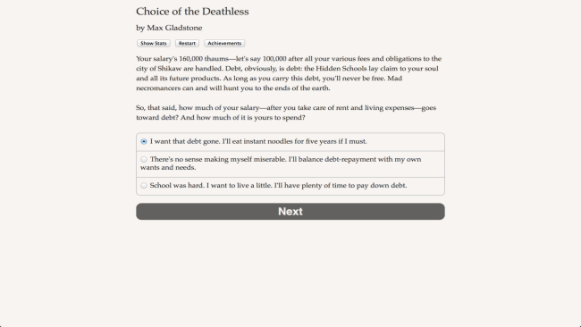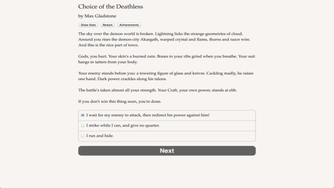 “Choice of the Deathless” is a necromantic legal thriller by Max Gladstone, Campbell Award-nominated author of Three Parts Dead and Two Serpents Rise. The game is entirely text-based–without graphics or sound effects–and fueled by the vast, unstoppable power of your imagination.