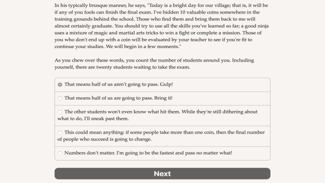 Choice of the Ninja is an epic, 185,000 word interactive fantasy novel by Katherine Buffington, where your choices control the story. It’s entirely text-based—without graphics or sound effects—and fueled by the vast, unstoppable power of your imagination.