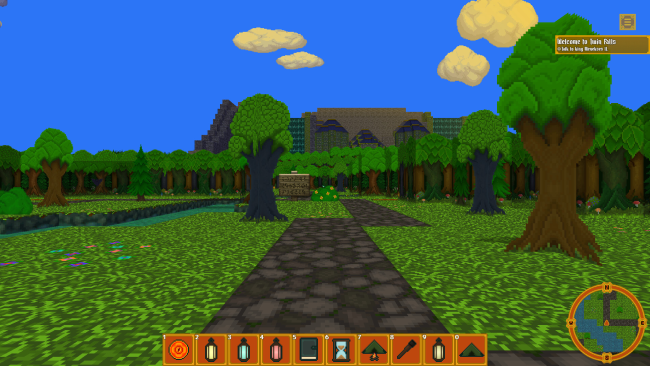 - First-person exploration in beautiful and colourful world created with 2.5D pixel graphics combining pre-made and custom assets.