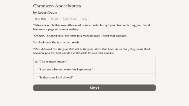 Chronicon Apocalyptica is a 250,000-word interactive medieval fantasy novel by Robert Davis. It’s entirely text-based, without graphics or sound effects, and fueled by the vast, unstoppable power of your imagination.