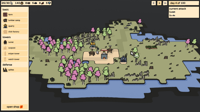 Each run gives you coins to spend in the shop. Buy new towers and upgrades like rapid click to survive longer! Fight progressively stronger enemies, like rabbits, bears and demon shamans. Can you overcome all enemies and reach day 100?