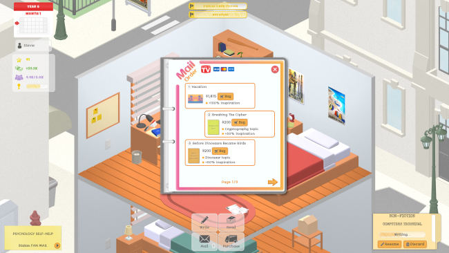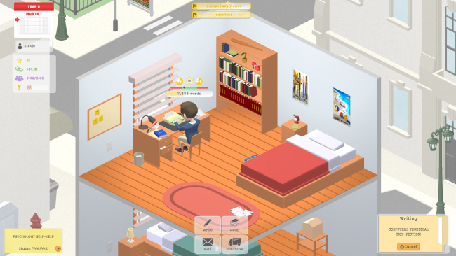 In Drafting Tales you play as a new writer working from your small apartment. Your goal is to become a well-known and successful author! You produce works of literature, whose quality depends on the genre/topic combinations that you select and the effort points that you allocate to your work’s literary elements. As you gain experience, you unlock new work types, genres, topics and purchasable items which provide you with perks, allowing you to improve your works and progress in the game.