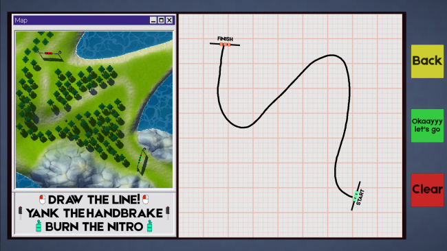 A racing game with indirect controls. Draw to drive! The car doesn’t have a pilot, but you are the navigator. Plot the course and break records!