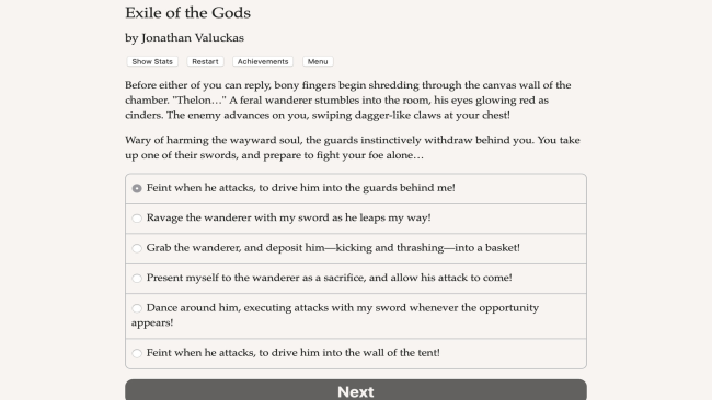 In the great war between the gods, will you wield the chains of destiny, or shatter them forever? Exile of the Gods is a 460,000 word interactive epic fantasy novel by Jonathan Valuckas, where your choices control the story. It’s entirely text-based—without graphics or sound effects—and fueled by the vast, unstoppable power of your imagination. Our story begins twenty years after the action of the first game, 2015’s Champion of the Gods. Which ending did you get? Start this game as the Champion, a warrior born to serve the gods, and follow the holy destiny the Weavers have crafted for you. Or start this game as the Exile, enemy of the gods, and forge a new life for yourself in the faraway land of Khovros–where mortals are free to choose their own fates. Champion and Exile alike must unravel a deadly conspiracy, and confront the brewing war upon their gods. Will you vanquish this invading force, or use its power to free your realm from its ruthless creators forever? Take revenge on the gods who exiled you, or steal this chance to prove your worth to the pantheon, and seize your destiny of glory? The gods made you what you are. Now, you will show them what you are made of.
