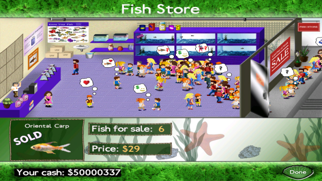 Fish Tycoon is a virtual fish breeding game. The object is to breed and cross breed fish until you find the 7 Magic Fish and solve the genetic puzzle. You will have to buy supplies like meds, eggs and special plants and then sell some of your fish in your virtual pet store. If you have enough money you can buy new supplies and customize your virtual aquarium.