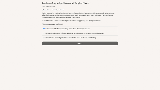 Duel wizards, cast spells, find true love, and keep your academic scholarship, all while investigating the mysterious disappearances plaguing your campus! Freshman Magic: Spellbooks and Tangled Sheets is a 263,000-word interactive gay romance novel by Raven de Hart. It’s entirely text-based, without graphics or sound effects, and fueled by the vast, unstoppable power of your imagination. A magical dueling scholarship won you a spot at the prestigious Briarthorn University, one of the top magic colleges in North America. You expected a hard workload and even harder dueling practice sessions…you weren’t expecting your classmates to be so distracting! You’ll have your pick when it comes to romance: Caleb’s a redheaded jock in the dueling club with you. Halim is a sexy rich boy, an enchantment major who works in the college library; Raimundo is a shy, nerdy tutor, but you can read between the lines, and Alistair carries an air of mystery around him you find very intriguing. With all magical energy and romance floating around campus, you’re even seeing your best friend, Noel, in a slightly different light…. But everything is not as it seems at Briarthorn. When students start disappearing from campus, it will be up to you to figure out what happened to them, who will be next, and can this malevolence be stopped?