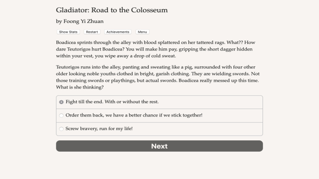 The Romans call you many names. A slave. A gladiator. A champion. Who and what will you be? You decide. Conquer the arena, navigate petty Roman politics and etch your name in the annals of Rome! Or die trying. Gladiator: Road to the Colosseum is a 220,000 word interactive novel by Foong Yi Zhuan, where your choices control the story. It’s entirely text-based—without graphics or sound effects—and fueled by the vast, unstoppable power of your imagination.