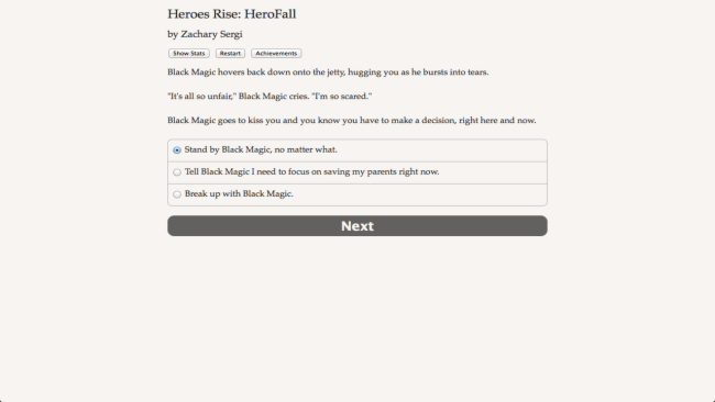 Would a hero like you assassinate the president of the United States to defend the right to be Powered? As the corrupt President Victon launches his oppressive campaign of Powered Regulation, your Legendary heroic rise transforms into something much more: you must become a political icon fighting to restore Powered rights in America. This new battle takes a twisted turn when your once-greatest enemy, Prodigal, tells you President Victon’s darkest secret…. Now you are faced with the biggest choices of your career: Do you trust the word of your archenemy? Will you evade President Victon’s gang of criminal bounty hunters? Can you save your family and complete your rise as a Legendary hero? “Heroes Rise: HeroFall” completes the epic Heroes Rise trilogy by Zachary Sergi, featuring the smash hits “Heroes Rise: The Prodigy” and “Heroes Rise: The Hero Project,” interactive novels where your choices control the story. The Heroes Rise trilogy is entirely text-based—without graphics or sound effects—and driven by the vast, unstoppable power of your imagination. All of your decisions lead to this epic conclusion, where you must truly define what you believe is right and what you stand for as a hero—and what (or whom) you’re willing to sacrifice for those ideals. Play as male or female, gay or straight, and decide how your story will end. How many alternate endings can you unlock?