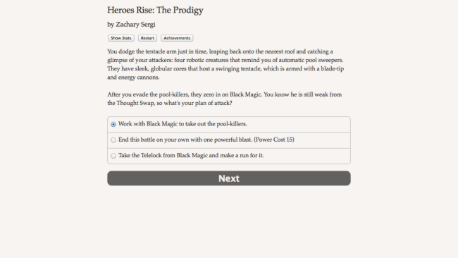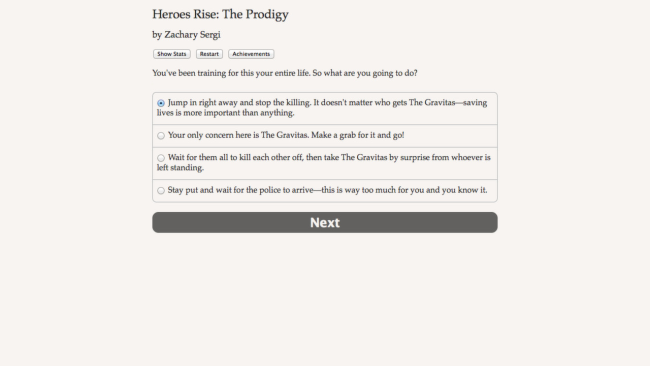 Do you have what it takes to become a legendary Powered hero? In “Heroes Rise,” Powered heroes have become the ultimate celebrities, and you dream of joining the A-List–but to get there, you’ll first have to take down evil Powered gangs, compete with deadly rivals, choose a worthy sidekick, team up with famous champions, and prove to all of Millennia City that you’re a true hero. “Heroes Rise: The Prodigy” is an epic interactive novel where your choices control the story. The game is entirely text-based–without graphics or sound effects–and fueled by the vast, unstoppable power of your imagination. Will you play as male or female? Gay or straight? Crusade for justice, or gun for money? Will you work as a team with the world-famous Millennial Group, or will you steal their spotlight?