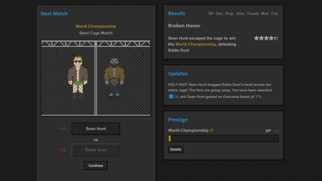 - Manage Wrestlers: Take charge of your wrestlers’ careers. Improve their skills, teach them new traits and determine their creative paths. Book them well and fulfill their requests to keep their morale high. Neglect them, and they could leave – perhaps even for your competitors!