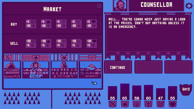 The king is dead, long live the king! Now it’s your turn to rule your small 8-bit style kingdom. Unfortunately, our country has seen better days: the hordes from the south are about to invade, our economy and morale are pretty low, and rumors spread of assassins in town. Make decisions that count, but be cautious. You never know when you’ll die.