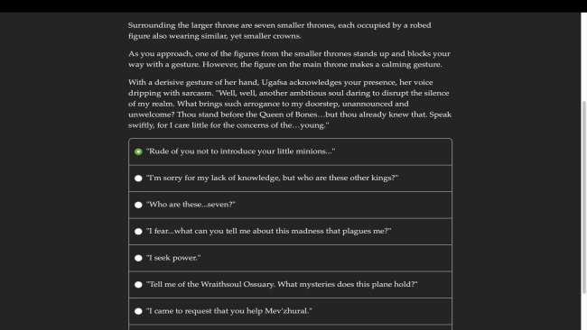 Life as a Lich is a 200,000 word interactive novel by Adrao, where your choices control the story. It’s entirely text-based—without graphics or sound effects—and fueled by the vast, unstoppable power of your imagination. It is a sequel to both one of the endings of Tokyo Wizard and one of the endings of Raiders of the Icepeak Mountains, or it can be played as a standalone game by creating a new character.