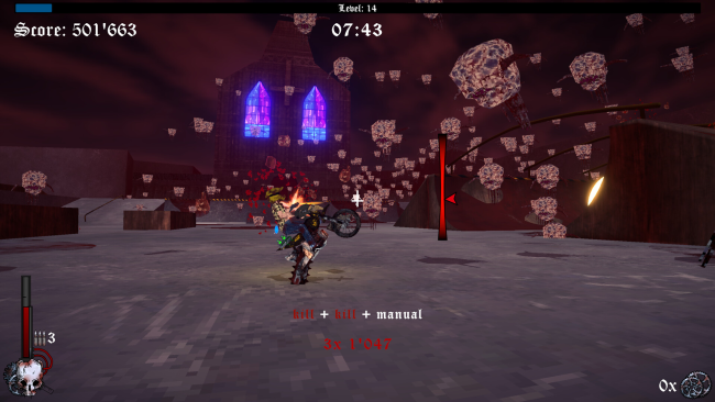- Combine your trick combo with kills to earn even more points. Once you land your combo, gain experience points as high as the combo score. Earn enough points and you’ll be given the choice of one of three random Demonic Offerings. These upgrades grant you more power to defeat the ever growing horde of grotesque monsters. So jump up in the air, slow down time and shoot these demonic abominations!
