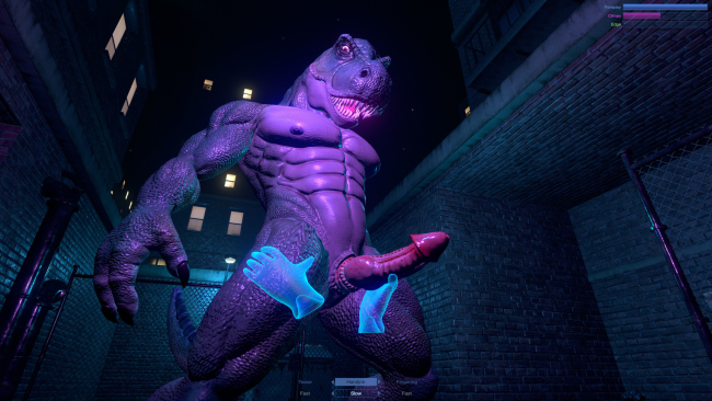 During the first intergalactic war, hope rested on the next generation of soldiers. Utilizing dinosaur DNA, science created strong and impressive warriors. Once the war ended, there was no longer a need for the dinosaur soldiers and so they were forced to the margins of society. The only thing left for them to do was to sell their bodies. Always threatened to be discovered and exposed. What was happening there in secret had been strictly forbidden for a good reason. Mutant Alley is a gay first-person sex simulation. You are going to interact with one of their most talented soldier’s: The anthropomorphic T-Rex.
