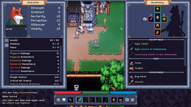 You play Reik, a clever member of the tribe of foxes. A chain of unfortunate events involves you in a quest of vital importance to all the peace-loving creatures of the realm. You will have to leave your home village and explore the world to become strong enough to stand up to evil. (In other words: There will be a main storyline but it’s still in the making!) The gameplay is inspired by classic Hack & Slays like Diablo and turn-based RPGs like Tales of Maj’Eyal or Stoneshard. However there is no permadeath in this game. It aims to be an accessible and entertaining Action-RPG. The lore is inspired by the classic Point & Click Adventure Inherit the Earth. As you explore the land, you’ll gain experience and unlock new abilities. Not all inhabitants will be friendly to you. Some will help you with information, others are only interested in trading, and still others will get in your way. Improve your equipment and collect useful resources in the environment to have a decisive advantage in battle.