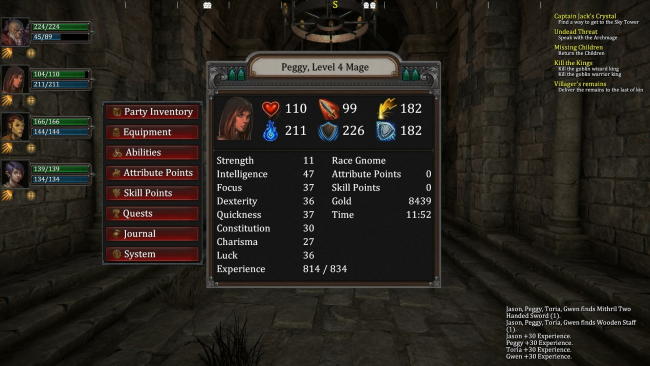 - Specialize characters with attribute points gained from leveling up. These may be spent on Strength, Intelligence, Focus, Dexterity, Quickness, Constitution, Charisma and Luck