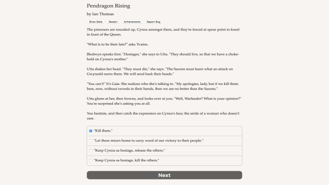 “Pendragon Rising” is a thrilling 112,000-word interactive novel by Ian Thomas, where your choices control the story. It’s entirely text-based–without graphics or sound effects–and fueled by the vast, unstoppable power of your imagination.