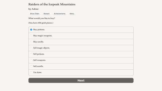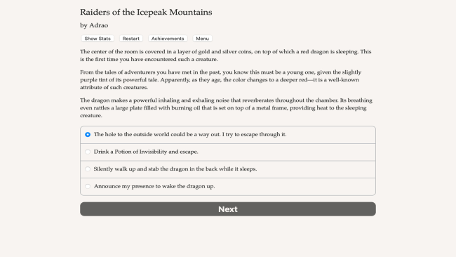 The orc tribes of Icepeak Mountains are threatening human settlements. Do you have the courage and determination to defeat their clans? Try to survive deadly dungeons and level up as an adventurer. Raiders of the Icepeak Mountains is a 120,000 word interactive gamebook by Adrao, where a combination of your choices and the roll of dice will determine your destiny. The game is text-based, with artwork allowing you the chance to actually see the exotic locations and dungeons you will visit on your journey. You will start as a novice adventurer, either a fighter, cleric, wizard or rogue, and level up through a series of quests, either those related to the main story of the game, or other side adventures. The dungeons you will visit have some element of randomness to them, ensuring that even if you play multiple times you will still discover some new secret rooms and monsters. You will have to carefully choose between the abilities and spells at your disposal, and manage well the treasure you loot to buy a variety of objects that can help you in your quests.