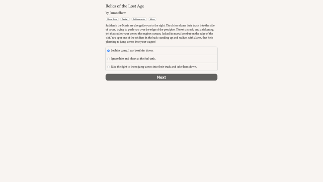 The Nazis are on the trail of six ancient magical artifacts powerful enough to crush all opposition and conquer the world. But they didn’t take one thing into account: you. Relics of the Lost Age is a swashbuckling 350,000 word interactive adventure novel written by James Shaw, where your choices control the story. It’s entirely text-based, without graphics or sound effects, and fueled by the vast, unstoppable power of your imagination. It started out as a routine dig in Palestine. But soon you find yourself racing across the desert on a quest to track down a fabled ancient relic before the Nazis can get their hands on it. And that’s just the beginning. The Third Reich are mobilizing right across the globe, on the hunt for mysterious ancient Relics of Power, objects which could put unimaginable supernatural forces into the hands of the armies of darkness. And the only thing standing in their way is you. Step into the weathered boots of a swashbuckling 1930s archaeologist and strap in for a wild ride around the globe, finding adventure, romance, and mystery at every turn. Do you have what it takes to locate the Relics, vanquish your foes and save the world from a thousand years of darkness?