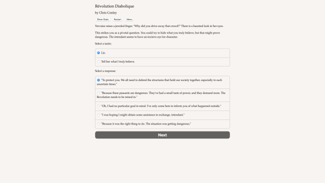 Summon demons to win the French Revolution! Will you uphold the Republic, restore the monarchy, rule France yourself, or lose your head? Révolution Diabolique is a 425,000-word interactive dark fantasy novel by Chris Conley. It’s entirely text-based, without graphics or sound effects, and fueled by the vast, unstoppable power of your imagination. As a demonologist in eighteenth-century France, you study the world’s most dangerous forbidden magic in the safety of your provincial estate. You can summon forth a breathtaking variety of demons: some creep subtly around your enemies to confuse and distract them; some appear as terrifying monsters; some guide you towards unlocking even deeper secrets of the universe. Now that the flames of revolution are beginning to kindle, you cannot hold yourself apart from politics for long. Every faction—monarchists, republicans, peasants, intellectuals, anarchists—would love to benefit from your power. Where will you send your demons? Will you unleash their power on the battlefield to aid or hinder the Revolution’s armies—or march on Paris itself? Will you lead a political faction with the secret knowledge that you have gained? Will you inspire a new cult dedicated to demons? But all power comes with a price, and as you rise up, you will need to sacrifice something: your reputation, your fortune, your safety…or possibly even your life. When the dust clears, will it be you who rules France?