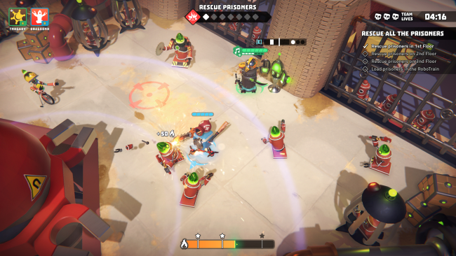 Team up with friends or allies and fight your way through hordes of alien-controlled robots that have overtaken this world of machines. Assemble your Robos from the most unlikely household parts and create a party that complements each other’s skills to become the ultimate gear crunching machine. Build your Robo by choosing a body, a head, two weapons and an engine from a variety of options. Use chainsaws, disco balls, tennis ball launchers and even a time-bending clock to get the look and playstyle that works for you. Then make it yours by unlocking skins, avatars and emotes. In the honored tradition of twin stick shooters, Robo Revenge Squad gives you challenging, satisfying combat but with unique emphasis on melee combat and experimentation. You’ll need to master each part’s skills and how parts work together to survive the onslaught of Senior Cleaners, Foremen and Boilees. Only then can you even think about tackling Juicy Joe or the dreaded Le Kraque!