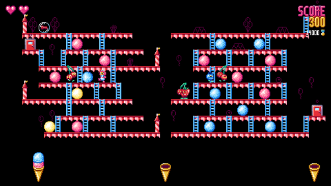 Scoop Kick! is a modern arcade style game inspired by multiple classic titles of the past! In this game you control Ms. Cream and her friends on their quest to retrieve all the stolen ice cream from the evil Juice Bunch. Kick ice cream scoops, squish enemies, solve puzzles and try to assemble the tallest ice cream cone. How about you aim for the high score or try to get the best time while you’re at it? Key features: