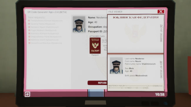 This game is a simulation of self-isolation. The game takes place in a fictional country called the Yublin Federation where people get sick with a virus called SOVID-19. You are in self isolation. Only you, your work, your wife, your daughter and 4 walls. Money and products is limited and melting away before our eyes. You work remotely from your computer to the government and you need to issue QR codes to the people to allow them to go out. On the first day of your work, a decree was issued that all people over 65 have to stay at home, therefore, you need to refuse to issue codes to them. With each passing day, the conditions for issuing are becoming tougher. Remember that you need to support your family, not to lose your job and finally not to go crazy. GAME FEATURES: