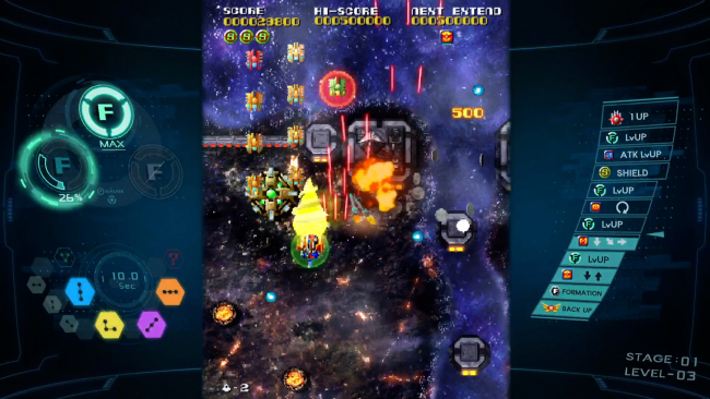 - Free-Form Docking: The Yamato, standing against the evil of Mega Zofer, is composed of 3 fighters. You’ll scramble with only one fighter at first, but pick up the right item and friendly fighters will appear for a power-up! Dock and split to change your attack properties and use different formations to access an amazing arsenal.
