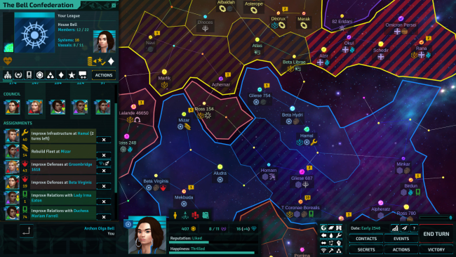 Humanity had just taken its first tentative steps in space, when the catastrophic destruction of Mother Earth plunges the galaxy into a new Dark Age. Centuries later, those few surviving colonies have stabilised into a simple feudal society, unable to comprehend or advance the technological artefacts they use to survive. Internecine fights between an aristocratic elite decide the fate of the scattered fragments of human kind. As the leader of a faction of star systems, you must seek to ensure the survival and prosperity of your dynasty. Expand your empire, herd your unruly vassals, build political alliances, and navigate a web of agendas, political intrigue and social obligations, to emerge as the dominant power of the galaxy.