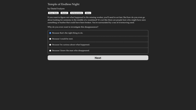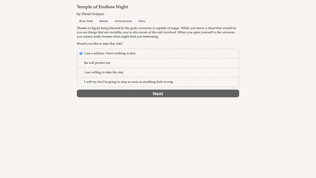 Use your voice to charm the people around you, or focus on the power of magic to destroy your enemies! Start a servant rebellion, or use poison to solve your problems! Do what your patron deity tells you to, or abandon their teachings! Stay loyal to the Pharaoh, or betray him and join the forces of darkness to change the face of Egypt forever! Temple of Endless Night is a thrilling 200,000 word interactive fantasy novel by Dariel Ivalyen, where your choices fully control the story. It’s entirely text-based—without graphics or sound effects—and fueled by the vast, unstoppable power of your imagination. When a strange man stops you on the streets of your hometown and sends you to an ancient temple that no one seems to know anything about, you grow both curious and worried. As the caravan gets closer to the mysterious place, you realize that the world around you isn’t exactly what it seems. You see things that are not there, and you can tell something is deeply wrong. Something is trying to influence your mind. When you find yourself surrounded by nightmares and illusions, will you use the light to cast them out, or will you help them become reality?