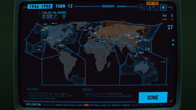 Command history in this most definitive Cold War strategy game. Gain access to your retro terminal and assert dominance through strategic arms races and disarmaments. Balance the world on the brink of mutually assured destruction to ensure total victory!