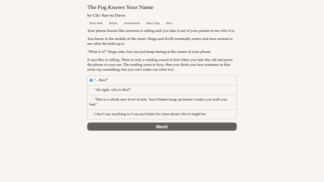 Step into the fog to confront your terror: the evil that hides within. The Fog Knows Your Name is a 300,000 word interactive teen horror novel by Clio Yun-su Davis, where your choices control the story. It’s entirely text-based, without graphics or sound effects, and fueled by the vast, unstoppable power of your imagination. It’s senior year of high school. Your classmate Rex Keller was found dead six months ago, and you were the last person to see him alive. Half the town thinks you murdered him, including his sister, Ennis. The other half believes it was the fog. In your town, ever since anyone can remember, people die when the fog rolls in. No one knows exactly how or why. Some say the land didn’t want the colonizers, so it sends the fog as an agent of vengeance. Some say the Devil himself lurks in the fog, collecting souls. Others believe the fog simply drives people mad, causing them to enact violence onto each other and onto themselves. There is one element of the tale that remains the same in every telling: those who perish in the fog are guilty of wronging another without confessing to it. Those who admit to causing harm can walk in the fog untouched. The liars die. Their ghosts haunt the town. They’re haunting you, they’re haunting Ennis Keller, and they’re haunting your friends at school. If you and your friends can’t unravel the fog’s mysteries in time, those ghosts are going to kill you, one way or another.