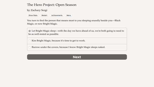 Can you win The Hero Project, America’s #1 reality competition for heroes? Team up with allies old and new to unravel a conspiracy threatening your world, and save the planet from destruction! The Hero Project: Open Season is a 170,000-word interactive novel, and the final installment of Zachary Sergi’s “Hero Project” series. It’s entirely text-based–without graphics or sound effects–and fueled by the vast, unstoppable power of your imagination. In a competition full of heroic stars, will you rise high enough to influence the way society views Powered people? What will you do when your fight soars to heights you never expected…and when your journey falls back into the perspective of the original Heroes Rise Trilogy main character? As you rise, the decisions you make will shape the world for your Powered peers—and shape your relationships and potential romances. Will you fight for Powered rights or personal gain?