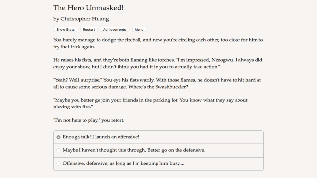 The Hero Unmasked is a 300,000 word interactive novel by Christopher Huang. It’s entirely text-based, without graphics or sound effects, and fueled by the vast, unstoppable power of your imagination.