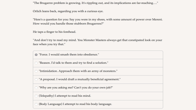 The Last Monster Master is an epic 250,000-word interactive fantasy novel by Ben Serviss, where your choices control the story. It’s entirely text-based—without graphics or sound effects—and fueled by the vast, unstoppable power of your imagination.