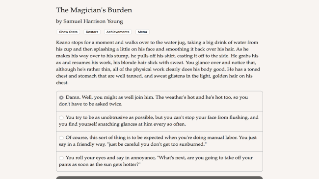 The Magician’s Burden is a 225,000 word interactive fantasy novel by Samuel Harrison Young, where your choices control the story. It’s entirely text-based—without graphics or sound effects—and fueled by the vast, unstoppable power of your imagination.
