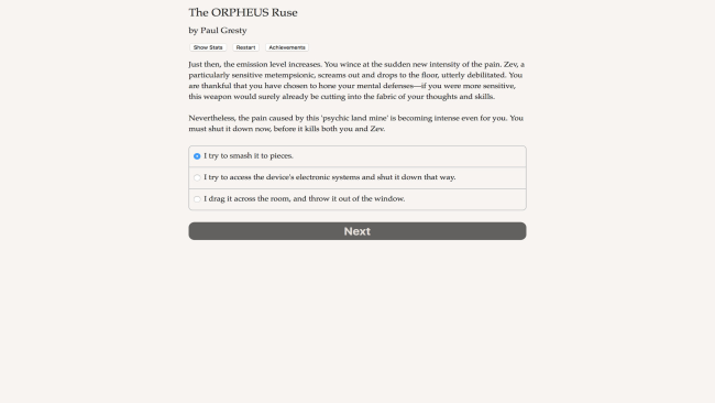 The ORPHEUS Ruse is a thrilling interactive spy novel by Paul Gresty, where your choices control the story. It’s entirely text-based–without graphics or sound effects–and fueled by the vast, unstoppable power of your imagination.
