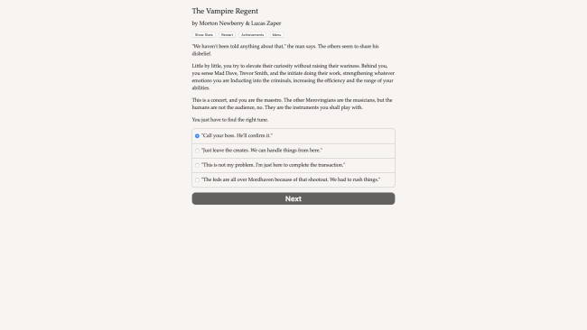 You rule over the vampires of a city in the heartland of the United States, and your decisions dictate the lives of mortals and immortals alike. The Vampire Regent is a 460,000-word interactive dark fantasy novel by Morton Newberry and Lucas Zaper, where occult political disputes and clashing loyalties tell the twisted story of a town designed for deceit. Manipulate the mayor so her projects align with your interests. Use high crime rates to conceal the activities of your kind, or suppress them to maintain an unsuspecting façade of order. Provide nourishment and safety for the vampires under your rule while trying to preserve the secret of their existence, and face the enemies that threaten it. Drink blood at nightclubs and listen to rumors and tragedies—or make some of your own. Practice the centuries-old tradition of fencing and put your skills to the test. Quench your thirst for blood, power, or knowledge, and even find love… if such a thing is possible for a non-beating heart.