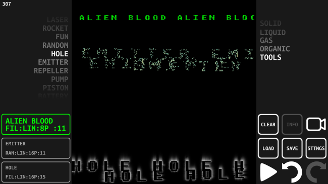 Toz is a falling-sand game with modern graphics and a large selection of elements, lots and lots of brush types and an abundance of special effects. Toz players can import pictures, share their creations in an online gallery, vote and load the creations of other people. The game also allows players to export animations as gif files. The game is for players who just want to watch interesting effects and interactions as soon as possible, as well as pixel artists who enjoy creating intricate drawings and scenarios using the zoom feature to watch them play out.