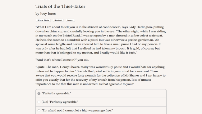 Trials of the Thief-Taker is a 140,000-word interactive historical adventure novel by Joey Jones, where your choices control the story. It’s entirely text-based, without graphics or sound effects, and fueled by the vast, unstoppable power of your imagination.