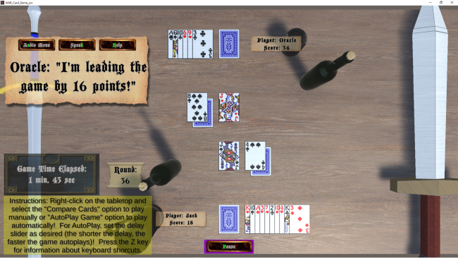 - GAME DURATION, ROUNDS AND LEAD TRACKING: The game tracks how long you play, the number of rounds played and who is in the lead and by how many points. The Oracle tells you who’s in the lead and by how much both by speaking to you and printing text on the screen.