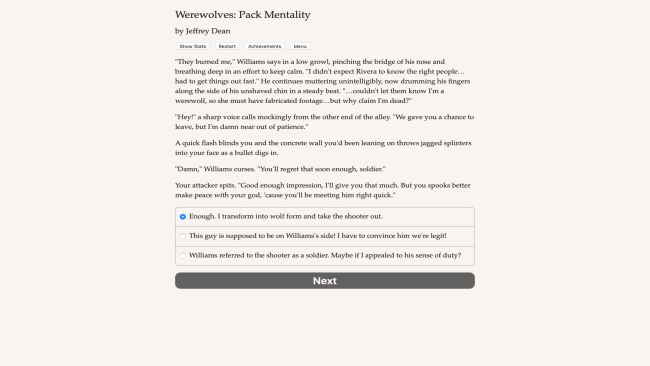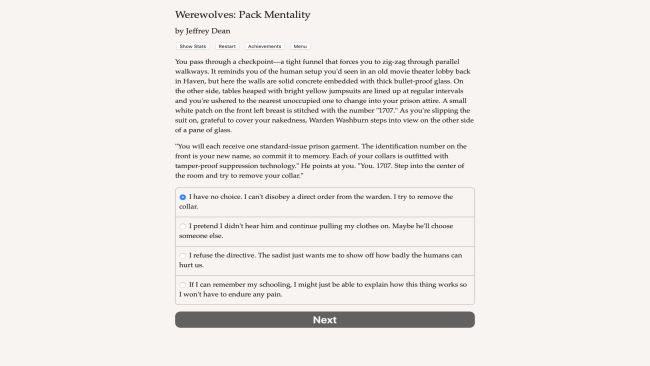 It’s a war between your werewolf pack and the Human Sovereignty Movement! Lead the pack to victory before extremists turn your packmates against each other. Werewolves 2: Pack Mentality is a 360,000 word interactive novel in Jeffrey Dean’s acclaimed ‘Claw, Shadow, and Sage’ series, where your choices control the story. It’s entirely text-based—without graphics or sound effects—and fueled by the vast, unstoppable power of your imagination. This thrilling sequel to Werewolves: Haven Rising seamlessly integrates your choices and experiences into a new tale of survival and loyalty, desperation and betrayal. After escaping the Haven werewolf detention camp and tasting freedom for the first time in your life, you and your pack must infiltrate “The Nail,” a top-secret underground military prison for werewolves, and liberate the prisoners. But integrating these new wolves into the greater pack will prove difficult, testing bonds and straining leadership to the breaking point. In your fight for freedom, you’ll confront the phantom of your father and his legacy of self-hatred, as well as the opposing fanaticism of werewolf supremacists more interested in domination than peace. In the end, the greatest threat to your pack’s survival may be what you fear most, as your inescapable feral nature threatens to tear your newly-forged pack apart!