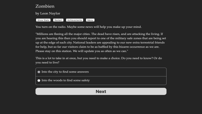 Zombien is a 275,000 word interactive novel by Leon Naylor, where your choices control the story. It’s entirely text-based—without graphics or sound effects—and fueled by the vast, unstoppable power of your imagination.